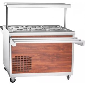 Температурный режим регулируется вручную и поддерживается автоматически, без постоянного контроля со стороны персонала. Над зоной выкладки установлен флуоресцентный светильник, который обеспечивает хорошую видимость и подчёркивает презентабельность представленных блюд. Вся конструкция выполнена из нержавеющей стали, устойчивой к влаге, механическим повреждениям и действию моющих средств.