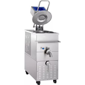 Аппарат оснащен холодильным блоком, встроенным в заднюю часть конструкции, что позволяет поддерживать как высокие, так и низкие температуры. Два сливных отверстия упрощают процесс ухода: одно предназначено для полного опустошения резервуара, другое — для частичного слива готового продукта. Конструкция оборудована четырьмя роликовыми колесами, два из которых оснащены стопорами для фиксации оборудования на месте. Полезный объем составляет 40 литров, а объём материнской закваски — 12 литров.