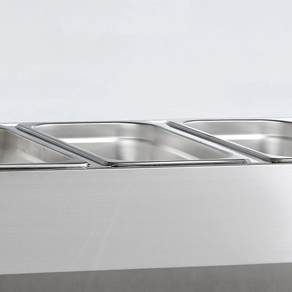 • Вместимость — 6×GN 1/3 глубиной 150 мм, удобно для салатов и закусок.