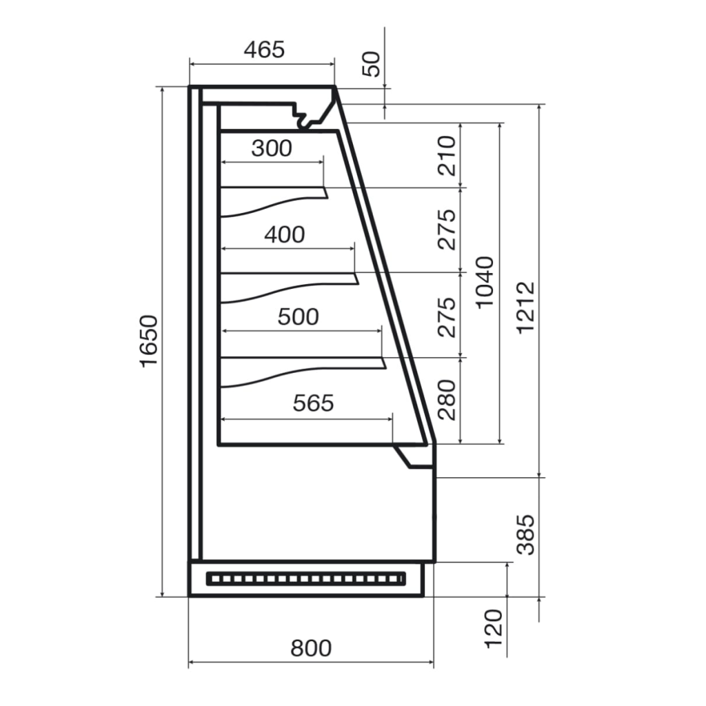 Модель оснащена подставкой со встроенным холодильным агрегатом и тремя навесными экспозиционными полками с наклонными профилями ценникодержателей, что обеспечивает удобную выкладку и презентацию продукции.