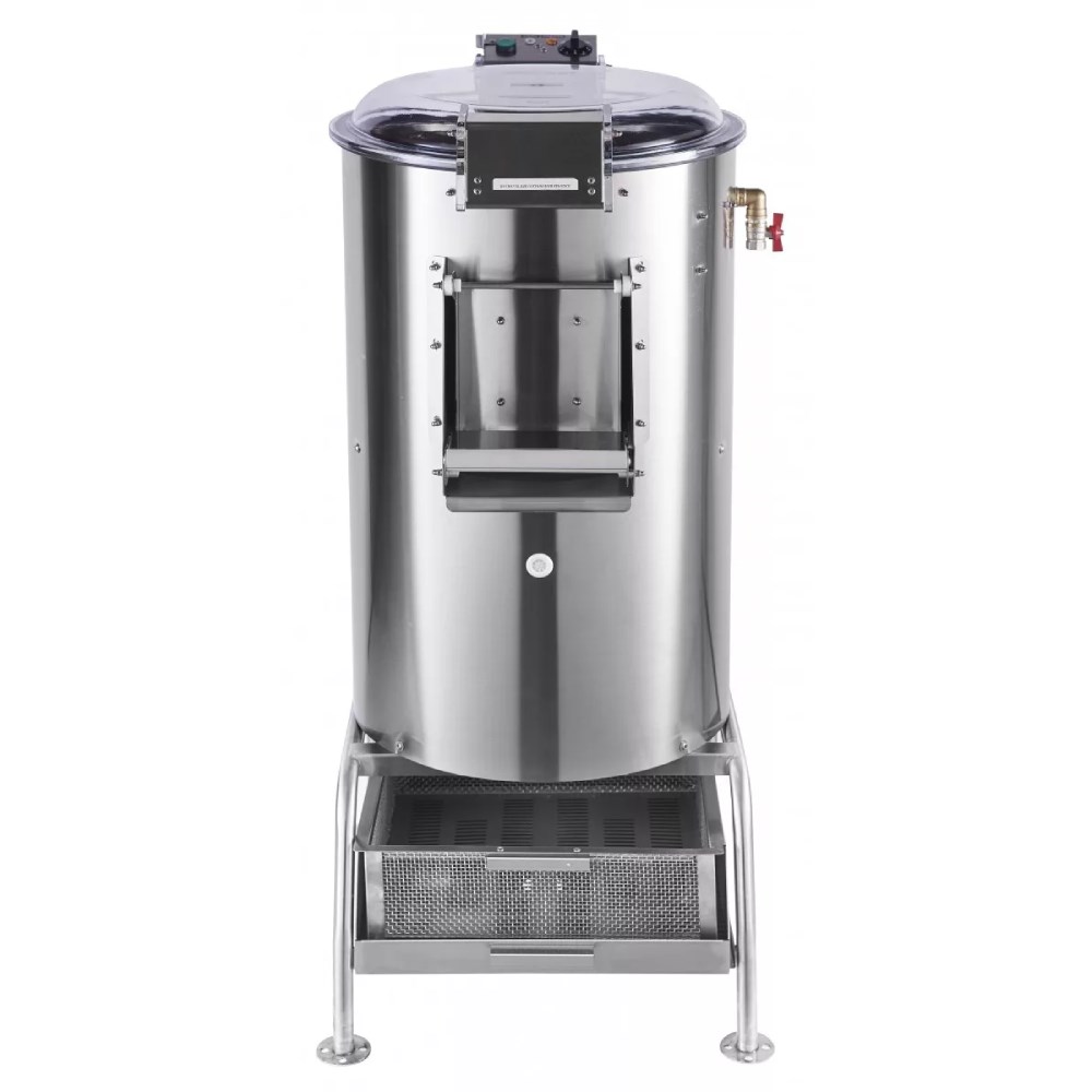 Машина запускается при помощи таймера, двигатель с защитой IP54 размещен в нижней части корпуса, а само устройство закрепляется к полу анкерными болтами. Класс влагозащиты корпуса — IP23. Объем загрузки составляет 10 кг, а максимальная производительность достигает 150 кг в час.