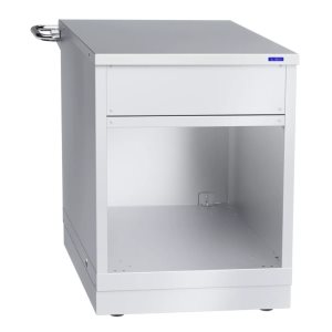 Каркас и панели модуля изготовлены из прочной нержавеющей стали, устойчивой к износу и влаге, что делает его подходящим для интенсивной эксплуатации в условиях кухни или обеденного зала. Под рабочей поверхностью расположен шкаф с распашными дверцами, предназначенный для хранения инвентаря и мелких принадлежностей, что способствует поддержанию порядка и удобству персонала.