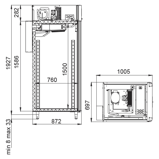 Каталог оборудования Холодильное оборудованиеШкафы холодильныеСпециализированные холодильные шкафыШкаф холодильный для вызревания салями Polair CS107 Salami со стеклом Шкаф холодильный для вызревания салями Polair CS107 Salami со стеклом Код товара: 062-631 Поделиться: WhatsAppTelegram СравнитьДобавить в КПВ избранное 0 385 050 ₽ В корзину 0 шт Под заказСамовывоз сегодня бесплатно Взять в кредит Купить в лизинг Получить консультацию в WhatsApp Описание Характеристики Отзывы 0 Инструкции 5 Шкаф холодильный для вызревания салями Polair CS107 Salami со стеклом предназначен для приготовления и хранения салями, сыровяленых колбас и других мясных деликатесов на предприятиях общественного питания и торговли. Корпус цельнозаливной конструкции выполнен из нержавеющей стали снаружи и внутри (кроме задней стенки), что обеспечивает высокую прочность и долговечность. Дверь выполнена в виде стеклопакета для удобного визуального контроля. Оборудование рассчитано на работу при температуре окружающей среды до +40 °С. Особенности: Динамическое охлаждение с мягким обдувом без заветривания Верхнее расположение агрегата Автоматическая оттайка с системой испарения конденсата Русифицированная многофункциональная панель управления с дисплеем 5" и возможностью создания и сохранения собственных программ Встроенный ультразвуковой увлажнитель (необходима подача очищенной воды и подключение к канализации) UV-лампа для обеззараживания воздуха внутри камеры 3 пары направляющих с тремя перекладинами и подвесами для колбас Регулируемый уровень влажности: от 60 до 95 % Распашная дверь с заливной теплоизоляцией, встроенной ручкой и магнитным уплотнителем Отключаемая внутренняя LED-подсветка Штампованное углубление в дне корпуса для удобства ухода Педаль для удобного открытия двери Хладагент R290 (пропан) Толщина стенки корпуса: 43 мм Polair CS107 Salami со стеклом — это профессиональный шкаф, разработанный специально для мясных деликатесов. Он обеспечивает оптимальные условия для ферментации и хранения продукции за счёт точного контроля температуры и влажности, продуманной конструкции и удобного функционала. Такой шкаф станет надёжным решением для мясных цехов, гастробаров и специализированных магазинов.Изображение товара, представленного на фото, может отличаться от его фактического вида. Показать все Габаритные размеры697×1005×1960 ммДиапазон рабочей температурыот -2 до +30 °CДлина697 ммШирина1005 ммВысота1960 ммОбъём700 лКол-во дверей1 Тип двериСтеклянная Уровень влажностиот 60 до 95 %Холодильный агрегатВстроенный Тип оттайкиАвтоматическая Тип охлажденияДинамическое ПодсветкаЕсть UV-лампаЕсть ХладагентR290 Вес нетто160 кгВес брутто190 кгБрендPolairВсе специализированные холодильные шкафы Из нержавейкиВсе специализированные холодильные шкафы Стеклянная дверь Оставить отзыв Еще никто не оставил отзыв на этот товар Схема POLAIR CS107 Salami.jpgИнструкция на POLAIR CS107 Salami.pdfБрошюра на POLAIR CS107 Salami.pdfДекларация о соответствии.pdfСертификат соответствия.pdf Похожие товары Перейти в каталог Под заказ 390 915 ₽ Шкаф холодильный для вызревания салями Polair CS107 Salami Под заказ 385 475 ₽ Шкаф холодильный для вызревания сыра Polair CS107 Cheese полки окраш. Под заказ 248 490 ₽ Шкаф холодильный для вызревания мяса и сыра Carboma M700GN-1-G-MHC 9006 Под заказ 392 700 ₽ Шкаф холодильный для вызревания мяса Polair CS107 Meat черный, со стеклом (Тип 2) Под заказ 389 300 ₽ Шкаф 
