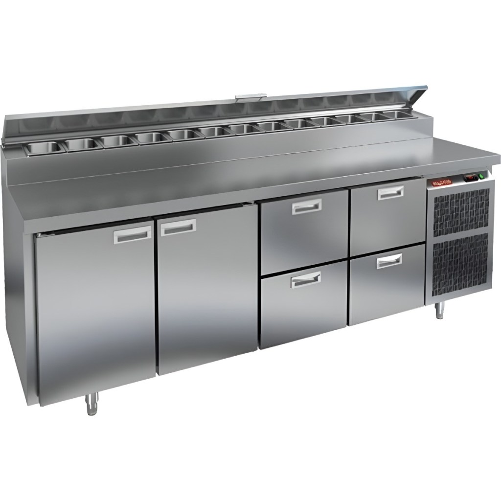 Стол холодильный для пиццы HiCold PZ2-1122GN (1/6) предназначен для кухонь и предприятий общественного питания. Он используется для раскатки теста, подготовки ингредиентов для пиццы, салатов и других блюд, а также для охлаждения и кратковременного хранения скоропортящихся продуктов. Модель совмещает нержавеющую рабочую поверхность и охлаждаемый отсек с 2 дверями и 4 ящиками, обеспечивая удобный доступ к ингредиентам и эффективное хранение.