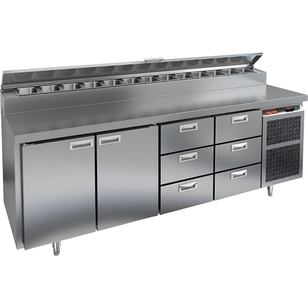 Стол холодильный для пиццы HiCold PZ2-1133GN (1/6) предназначен для кухонь и предприятий общественного питания. Он используется для раскатки теста, подготовки ингредиентов для пиццы, салатов и других блюд, а также для охлаждения и кратковременного хранения скоропортящихся продуктов. Модель совмещает нержавеющую рабочую поверхность и охлаждаемый отсек с 2 дверьми и 6 ящиками, обеспечивая удобный доступ к ингредиентам и эффективное хранение.