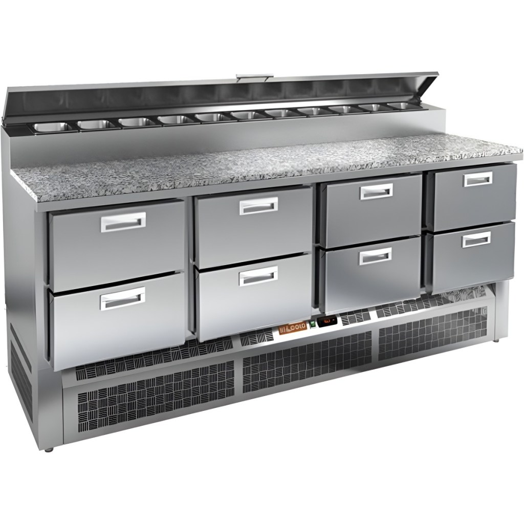 Каталог оборудования Холодильное оборудованиеСтолы охлаждаемыеСтолы холодильные для пиццыСтол холодильный для пиццы HiCold PZE2-2222/GN (1/6H) Стол холодильный для пиццы HiCold PZE2-2222/GN (1/6H) Код товара: 064-964 Поделиться: WhatsAppTelegram СравнитьДобавить в КПВ избранное 0 342 622 ₽ В корзину 0 шт Под заказСамовывоз сегодня бесплатно Взять в кредит Купить в лизинг Получить консультацию в WhatsApp Описание Характеристики Отзывы 0 Стол холодильный для пиццы HiCold PZE2-2222/GN (1/6H) предназначен для использования на предприятиях общественного питания и торговли. Он совмещает охлаждаемый объём и удобную рабочую поверхность, обеспечивая повару быстрый доступ к ингредиентам и комфорт при подготовке блюд — от пиццы и салатов до закусок и десертов. Модель отличается прочной и гигиеничной конструкцией: корпус и столешница изготовлены из нержавеющей стали, что гарантирует износостойкость и лёгкость в уходе даже при интенсивной эксплуатации. Ключевые особенности: Электронная панель управления – точная регулировка температурного режима 8 выдвижных ящиков — позволяют удобно распределить ингредиенты и оптимально организовать пространство для хранения продуктов Салат-бар на 10 гастроемкостей – удобное размещение и быстрый доступ к ингредиентам Автоматические доводчики дверей с фиксатором открытого положения – комфорт при работе Легкозаменяемые магнитные уплотнители – надёжная герметизация и простота обслуживания Открытая агрегатная часть – лёгкий доступ для технического обслуживания Регулируемые по высоте ножки – устойчивость на разных типах покрытия Максимальная глубина гастроемкостей: 100 мм Глубина рабочей поверхности: 486 мм Толщина столешницы: 50 мм Hicold PZE2-2222/GN (1/6H) — универсальный стол для пиццы, сочетающий вместительное охлаждение и рабочую поверхность из нержавеющей стали. Подходит для ресторанов, кафе и пиццерий, где важно удобство, гигиена и надёжность оборудования.Изображение товара, представленного на фото, может отличаться от его фактического вида. Показать все Габаритные размеры1970×700×990 ммДиапазон рабочей температурыот +2 до +10 °CРасположение агрегатаНижнее Материал столешницыНержавеющая Тип столаС ящиками Объём505 лТип гастроемкостейGN 1/6 Количество ящиков8 штРазмер полки530×325 ммНапряжение220 ВМощность0,46 кВтТип охлажденияДинамическое Тип оттайкиАвтоматическая СтолешницаС бортом Габариты в упаковке2200×850×1180 ммВес нетто100 кгВес брутто135 кгБрендHicold Оставить отзыв Еще никто не оставил отзыв на этот товар Ранее просмотрено Под заказ 188 351 ₽ Витрина холодильная универсальная Dazzl Galaxy 080 250 динамика, прессервы 200 906 ₽ Витрина холодильная ВПC 0,39-2,4 (Italfrigo Veneto 2500 Д) Под заказ 290 061 ₽ Стол холодильный для пиццы HiCold PZ1-1111GN (1/3) камень Под заказ 283 311 ₽ Стол холодильный для пиццы HiCold PZE2-1112/GN (1/6) камень