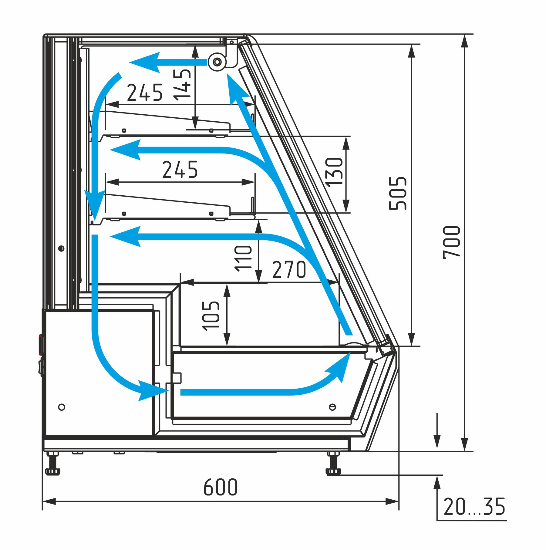 • Высота выкладки продуктов: до 150 мм на нижнем поддоне, до 100 мм на полках.