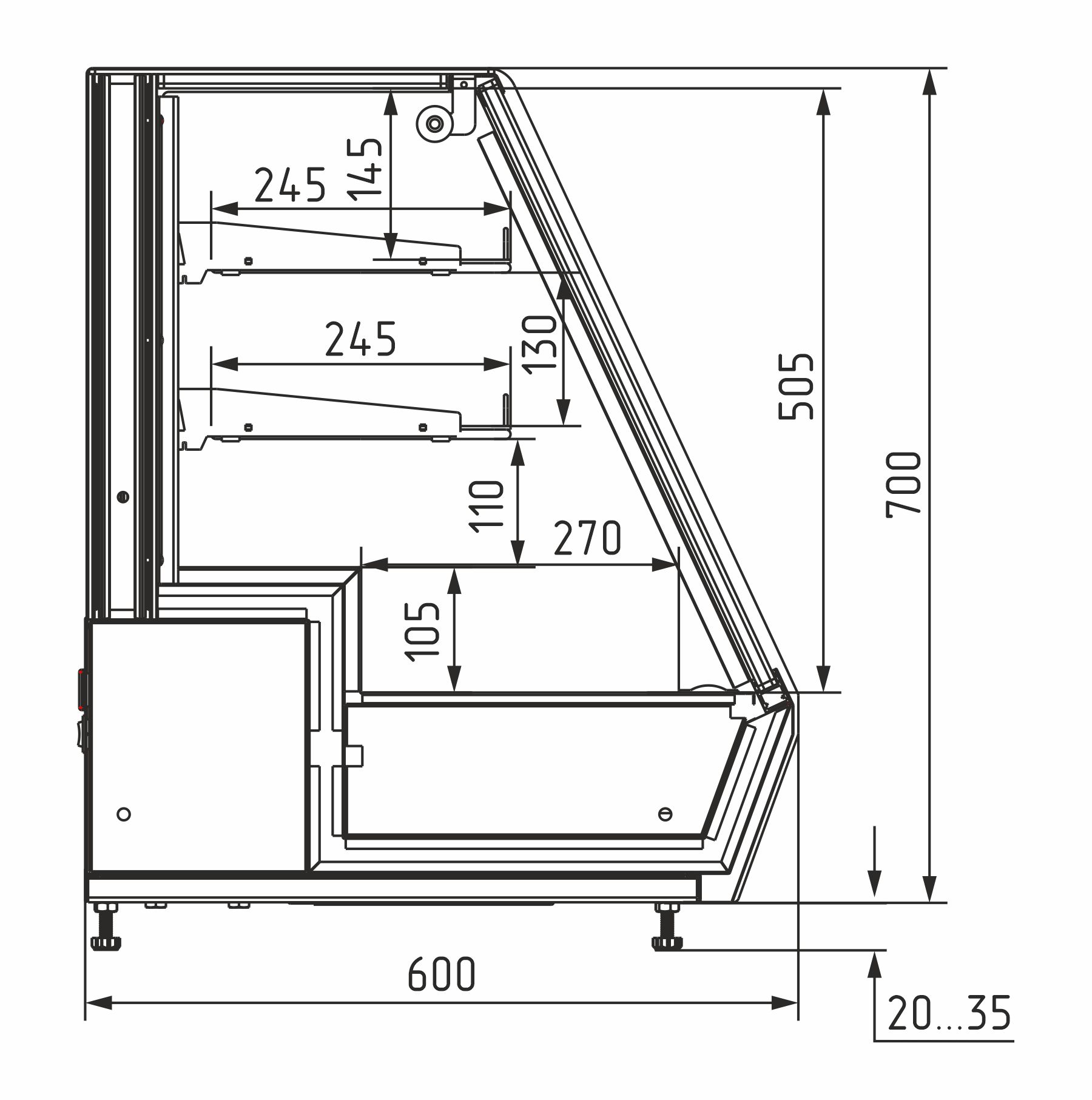 Высота выкладки: до 150 мм на нижнем поддоне, до 100 мм на полках.